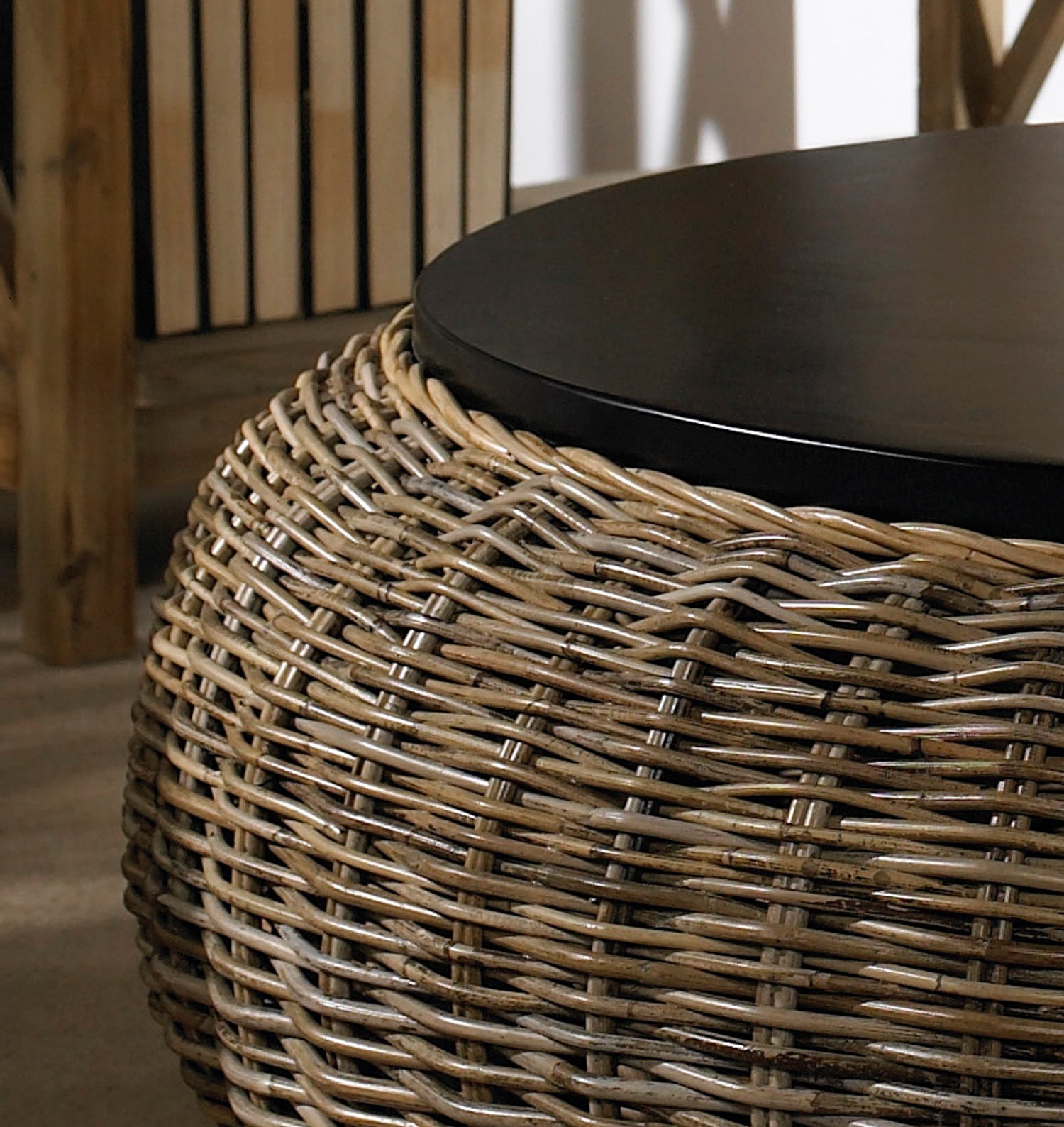 The natural Kubu weaving material is a soft gray color, which is achieved naturally by soaking the rattan in local clay and sun-drying it before weaving. The top is solid hardwood, finished in a deep brown.A clear topcoat preserves the color and protects the chair from spills.